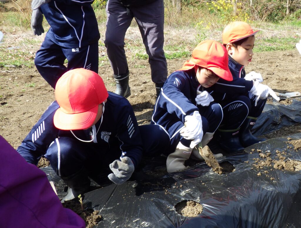 はじめに、全員でじゃがいもの植え方の説明を聞いてから、学級ごとに畝に穴を開け、種芋を入れて、土をかぶせていきました。