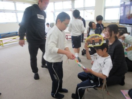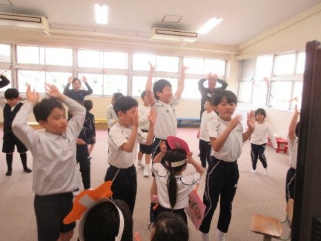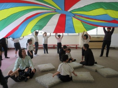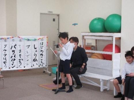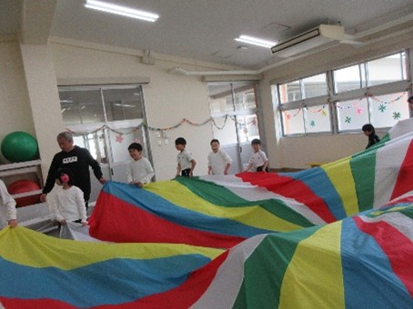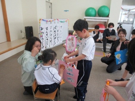 4月21日(火)、遊戯室で「入学おめでとう会」を行いました。星組の子どもたちが進行を務め、小学部みんなで手遊びやパラバルーンをして楽しみました。また、各学級からは、1年生の好きなものがたくさん詰まった素敵なプレゼントを贈りました。プレゼントされたお面やメダル、バッグを身に着けた1年生は、とてもうれしそうな様子でした。