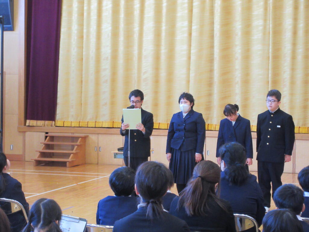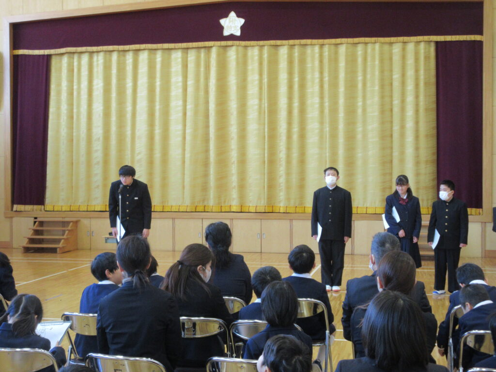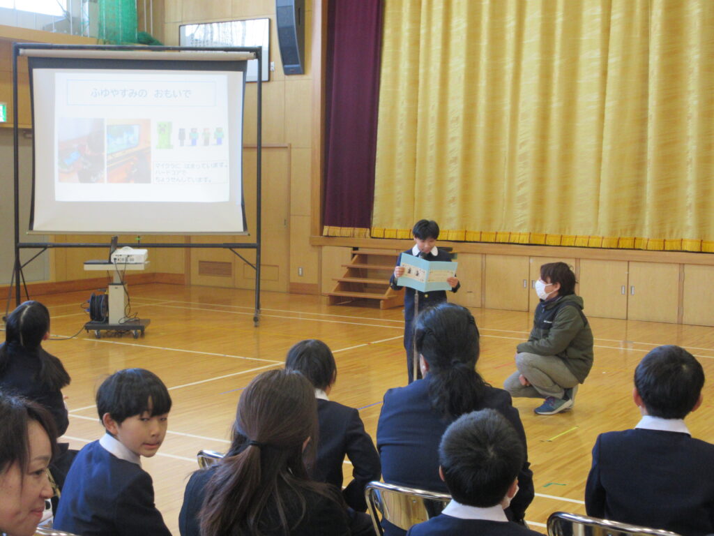 校長先生と挨拶をしてお話を聞いた後に、各部の代表が冬休みの思い出や3学期に頑張りたいことを発表しました。